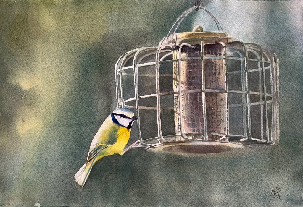 Bird on a feeder 38,5 x 56,5 cms watercolour and pastel