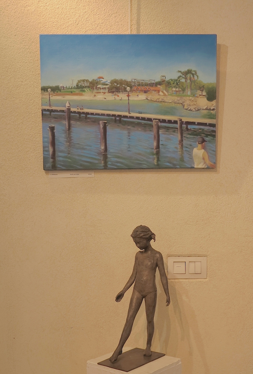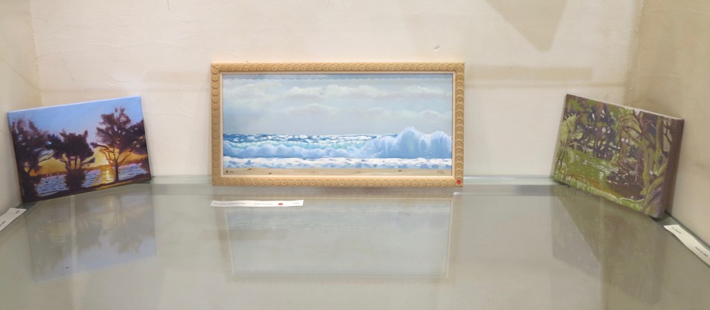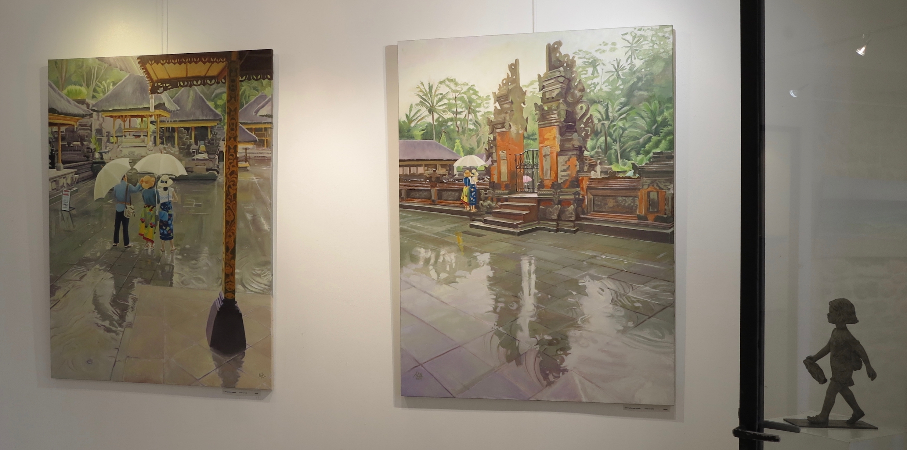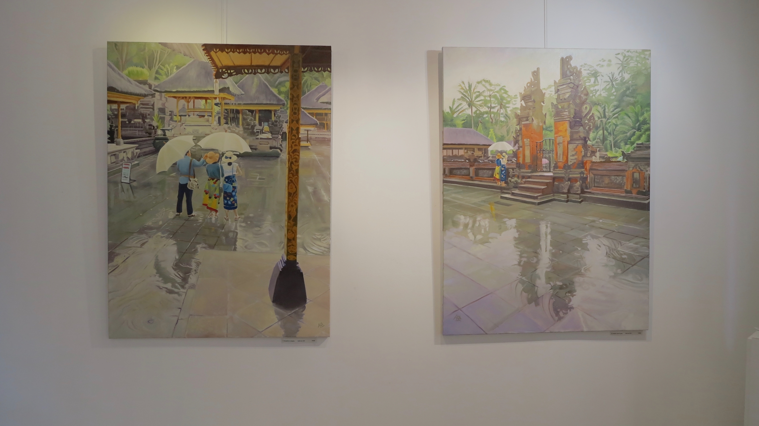 Les deux grandes toiles – “Parapluies et temples” et “Temples sous la pluie” sont des vues de Bali. Travaillées à partir de références photographiques prises lors d’un séjour là-bas en 2016. Ici, j’ai été séduit par les reflets sur les pavés mouillés et les jeux de lumière sur l’eau de pluie.